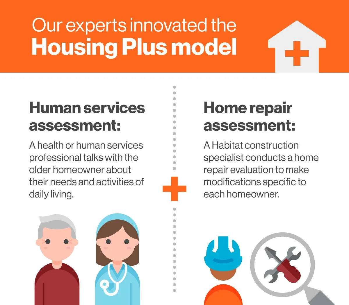 Habitat is consistently working at the intersection of housing, human services and health in all that we do. We innovated the Housing Plus model, a range of person-centered, holistic approaches that starts with the older adult’s needs, then builds out a solution that incorporates not only home repairs and modifications, but community resources as well.