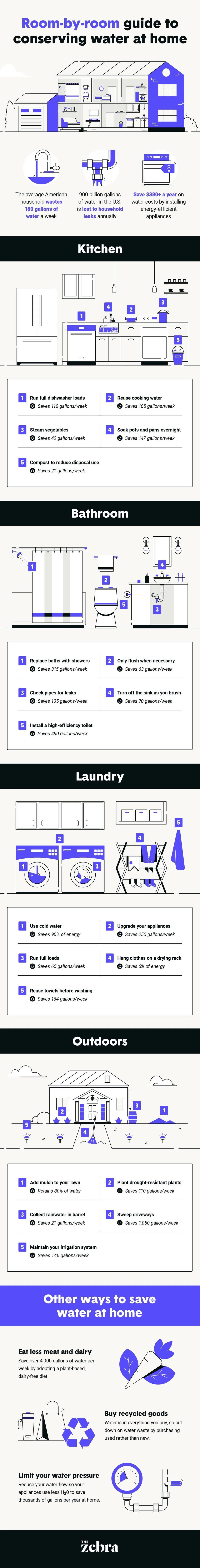 Conserving water at home protects the environment and energy-efficient solutions and appliances can save you money on your home insurance policy. Here’s a room-by-room guide to conserve water at home.